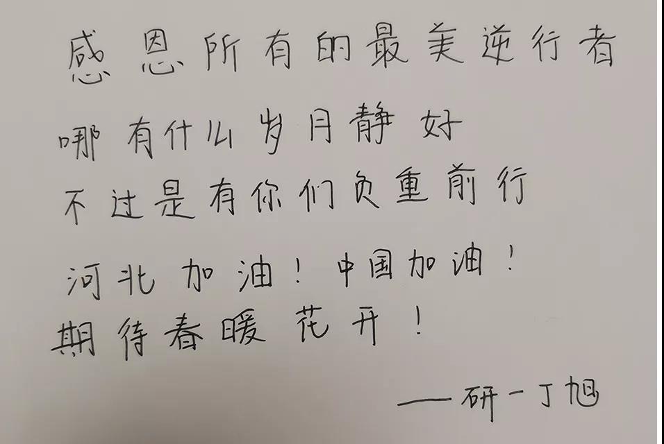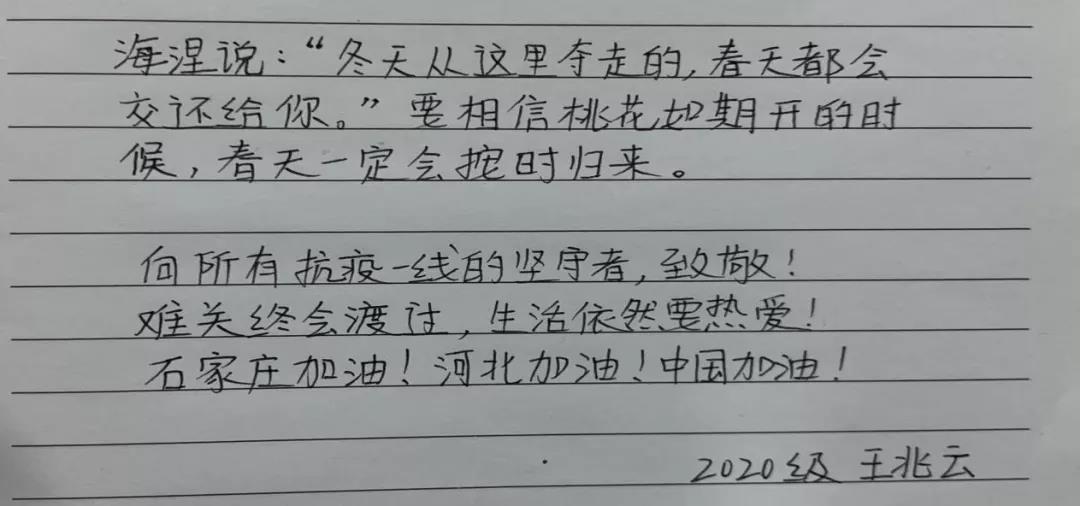 2021年1月以来,河北疫情反弹,牵动着全国人民的心。在石家庄、邢台疫情严峻的情况下,许多学生自愿参与到疫情防控的队伍中去,或者以其他的方式在这一特殊时期贡献着自己的力量。Beat365官网会计、技经党支部部分学生党员在自己的家乡加入到志愿者队伍中去,其他党员通过自己力所能及的方式为石家庄、邢台人民送上自己的祝福,盼望疫情早日消散,人们过上美好的生活。