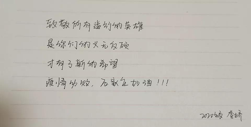 和 我在同一岗位,不同时间、不同地点工作的志愿者坚守在各自岗位,不同工作岗位,的志愿者也在各处发光发热,我做了一名学生力所能及的事,同时也尽到身为中共党员的一份责任。奋斗在一线的医生、警察等等,他们所要面对困难的远比我们青年志愿者更多,他们的默默守护,负重前行更加值得赞扬。所有奋斗在一线的工作人员,共同抒写了这可歌可泣的抗疫篇章,相信在大家共同的努力之下,终将彻底战胜新冠疫情!