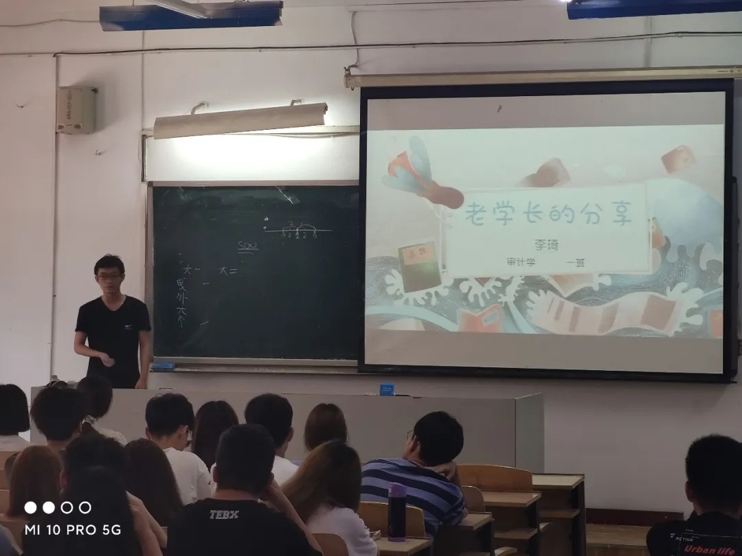 朱映寰是2017级会计学专业平均学分绩点排名第一,考取了北京物资学院会计学学硕。她结合自己的学习经历和体会,从考证、专业课学习,如何平衡生活和学习的关系三个方面向同学们娓娓道来。她建议同学们提高对自己的要求,脚踏实地,打好专业学习的基础,补齐短板,善于利于各种学习资源,提高自己的学习效率。她告诫大一学生当以学习为首,处理好学习与生活的关系。大学是提升自我的重要阶段,她希望大家都能把握好当下,努力锤炼本领,不断提升自己。