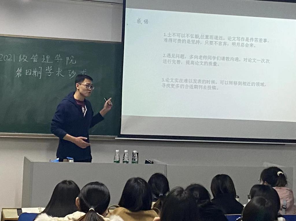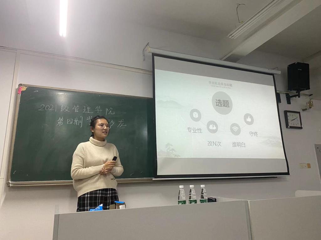 2021年11月10日,Beat365中文官方网站2021级研究生在教一楼303教室举行了本学期第四次学术交流活动。本次活动邀请到了2019级技经专业张亦池学长、会计专硕刘苗学姐和屠亚心学姐做论文写作方面的汇报。冯丽丽教授和2021级全体研究生参加了本次学术讲座。