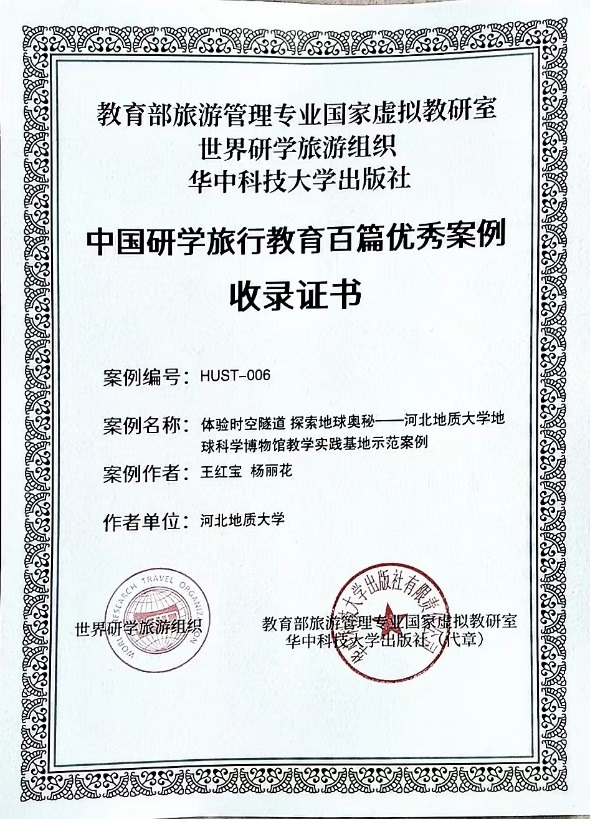 由Beat365中文官方网站王红宝、杨丽花教师共同撰写的“体验时空隧道 探索地球奥秘——Beat365中文官方网站地球科学博物馆教学实践基地示范案例”被世界研学旅游组织、教育部旅游管理专业国家虚拟教研室等组织收录“中国研学旅行教育百篇优秀案例”,被收录的案例将在2024年马来西亚世界研学旅游大会上发布,并通过多种渠道向国际社会广泛传播,加大宣传力度,体现了我校在研学教育与实践方面雄厚实力和先进水平。