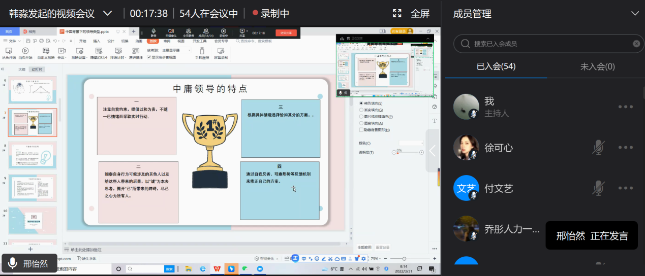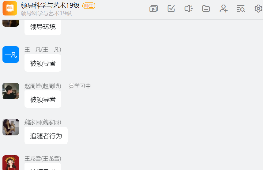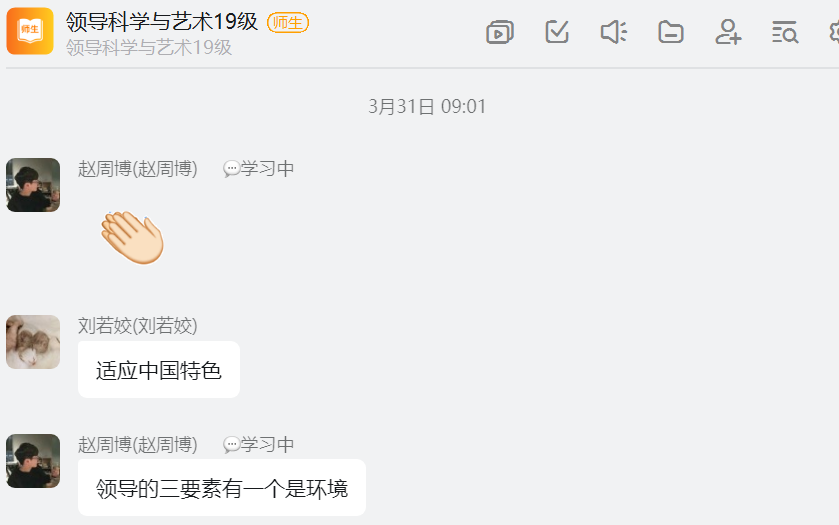 人力资源管理教研室韩淼老师在组织开展《领导科学与艺术》课程的线上教学时,考虑到学生在《管理学》和《组织行为学》上都学过相应基本知识,在前两次课程进行基本概念和范围讲解后,就由学生自由结合分组对老师选定的主题内容进行讲解。在本次课程中,其中有一节内容特意选择了“中国背景下的领导”章节内容进行讲解,领导力在中国和西方社会中的表现不同,本章内容主要是让学生了解在中国情境下的领导力研究,体现中国特色,增强文化自信。